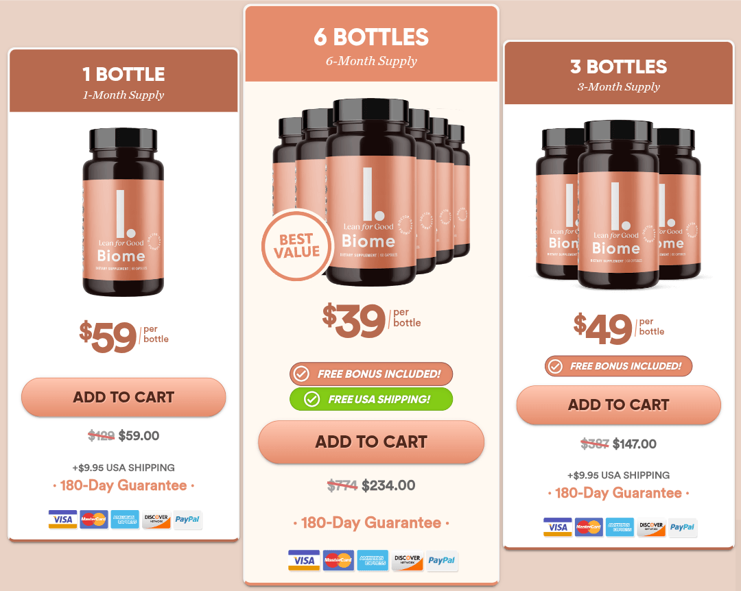 ➥ 6 month supply: 6 bottles of LeanBiome at $234 ($39 per bottle).